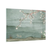 Billede på glas - En gren med blomster og fugle mod en baggrund af grønne bakker - 70x50cm - Forår, ah, det er dig - Moderne vægdekoration til stue og soveværelse ARTTOR