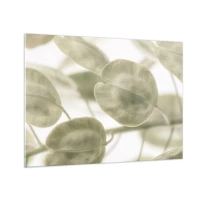 Billede på glas - Nærbillede af blade i bløde pastelgrønne nuancer - 70x50cm - I begyndelsen var der blade... - Moderne vægdekoration til stue og soveværelse ARTTOR