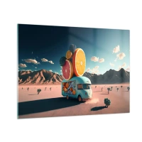 Billede på glas - En turkis campingvogn med frugt mod et ørkenlandskab - 70x50cm - En smag af ferie - Moderne vægdekoration til stue og soveværelse ARTTOR