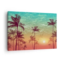 Lærredstryk - Billede på lærred - Solnedgang med palmer mod en farverig himmel - 70x50cm - Tropisk klima - Moderne vægdekoration til stue og soveværelse ARTTOR