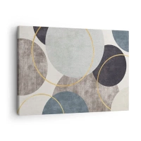 Lærredstryk - Billede på lærred - Geometriske cirkler i nuancer af grå, blå og guld - 70x50cm - Hjul efter hjul - Moderne vægdekoration til stue og soveværelse ARTTOR