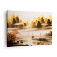 Lærredstryk - Billede på lærred - Et orientalsk landskab med en flod, bjerge og en let tåge. - 70x50cm - Længere væk end det fjerne Østen - Moderne vægdekoration til stue og soveværelse ARTTOR