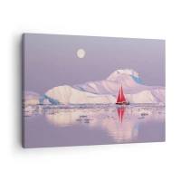 Lærredstryk - Billede på lærred - Et rødt sejl mod en baggrund af iskolde bjerge og en fuldmåne. - 70x50cm - Sejlets varme, isens kulde - Moderne vægdekoration til stue og soveværelse ARTTOR