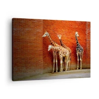 Lærredstryk - Billede på lærred - Fire giraffer mod en murstensvæg i kunstneriske omgivelser - 70x50cm - Kan du se nogen akacie? - Moderne vægdekoration til stue og soveværelse ARTTOR