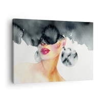 Lærredstryk - Billede på lærred - En kvinde med stilfulde briller og store øreringe - 70x50cm - Hemmeligheden bag elegance - Moderne vægdekoration til stue og soveværelse ARTTOR