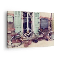 Lærredstryk - Billede på lærred - Vintagecykler foran en trædør med pastelfarvede skodder - 70x50cm - Længe leve provinsen - Moderne vægdekoration til stue og soveværelse ARTTOR