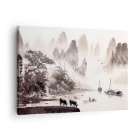 Lærredstryk - Billede på lærred - Et malerisk landskab i asiatisk stil med tågede bjerge - 70x50cm - Østens eksotiske hverdag - Moderne vægdekoration til stue og soveværelse ARTTOR