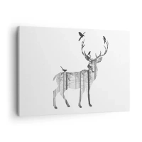 Lærredstryk - Billede på lærred - Silhuet af en hjort med skov og fugle - 70x50cm - Skovens gode ånd - Moderne vægdekoration til stue og soveværelse ARTTOR
