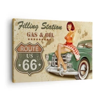 Lærredstryk - Billede på lærred - Retro Route 66-plakat med pin-up pige og bil - 70x50cm - De glorværdige 1940'ere. - Moderne vægdekoration til stue og soveværelse ARTTOR