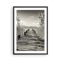 Plakat i sort ramme - En træbro blandt sivene over en sepiafarvet sø - 50x70cm - I græssernes fred - Moderne vægdekoration til stue og soveværelse ARTTOR