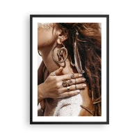 Plakat i sort ramme - Detalje af smykker på sandfarvet læderbaggrund - 50x70cm - Dronning af den vilde strand - Moderne vægdekoration til stue og soveværelse ARTTOR