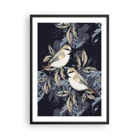 Plakat i sort ramme - To fugle mod en baggrund af dekorative blade og ornamenter - 50x70cm - Gul-blå espalier - Moderne vægdekoration til stue og soveværelse ARTTOR