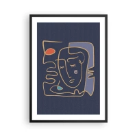 Plakat i sort ramme - Minimalistisk abstrakt ansigt på en marineblå baggrund i stregtegningsstil - 50x70cm - I drømmerier - Moderne vægdekoration til stue og soveværelse ARTTOR