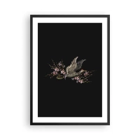 Plakat i sort ramme - En trane omgivet af blomstrende grene på en sort baggrund - 50x70cm - Eksotisk broderet fugl - Moderne vægdekoration til stue og soveværelse ARTTOR