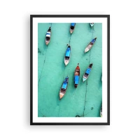 Plakat i sort ramme - Fugleperspektiv af fiskerbåde på turkisblåt vand - 50x70cm - I glædelig forventning - Moderne vægdekoration til stue og soveværelse ARTTOR