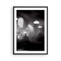 Plakat i sort ramme - En sort-hvid scene fra en atmosfærisk jazznatklub - 50x70cm - I en jazzet stemning - Moderne vægdekoration til stue og soveværelse ARTTOR