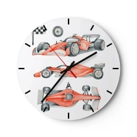Vægur, Uret - Røde racerbiler og et ternet flag på en hvid baggrund - 30x30cm - At indhente en drøm - Moderne vægdekoration til stue, køkken og soveværelse ARTTOR