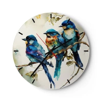 Vægur, Uret - Farverige fugle på en gren i akvarel illustrationsstil - 30x30cm - Er han fornærmet? - Moderne vægdekoration til stue, køkken og soveværelse ARTTOR