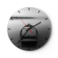 Vægur, Uret - En ensom båd på en rolig sø i sort-hvid. - 30x30cm - Længsel og melankoli - Moderne vægdekoration til stue, køkken og soveværelse ARTTOR