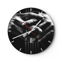 Vægur, Uret - Nærbillede af hænder, der holder en guitarhals i sort-hvid - 30x30cm - Kunstnerens bøn - Moderne vægdekoration til stue, køkken og soveværelse ARTTOR