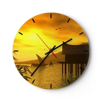 Vægur, Uret - Solnedgang over søen med et hus på pæle - 30x30cm - Ønsket fred - Moderne vægdekoration til stue, køkken og soveværelse ARTTOR
