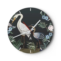Vægur, Uret - Dekorative fugle blandt planter på en mørk baggrund - 30x30cm - Fugleparade - Moderne vægdekoration til stue, køkken og soveværelse ARTTOR