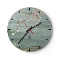 Vægur, Uret - En gren med blomster og fugle mod en baggrund af grønne bakker - 30x30cm - Forår, ah, det er dig - Moderne vægdekoration til stue, køkken og soveværelse ARTTOR