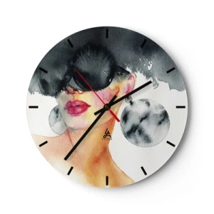 Vægur, Uret - Portræt af en kvinde med briller og store øreringe, akvarel - 30x30cm - Hemmeligheden bag elegance - Moderne vægdekoration til stue, køkken og soveværelse ARTTOR