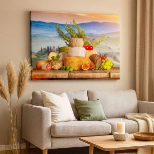 Lærredstryk - Billede på lærred - En sammensætning af oste og frugter mod baggrunden af det toscanske landskab - 70x50cm - Italiensk livsglæde - Moderne vægdekoration til stue og soveværelse ARTTOR