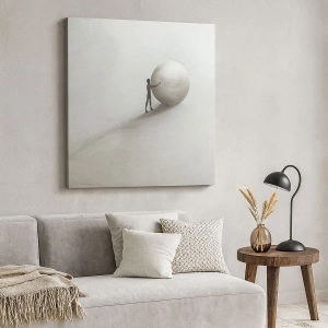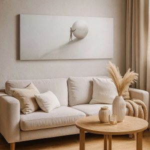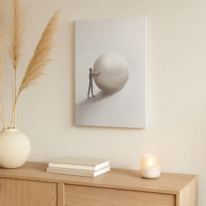 • Dette maleri forestiller en minimalistisk figur med en kugle mod en lys, monokromatisk baggrund. Perfekt til moderne og diskrete interiører. Lærredstrykket måler 70x50 cm.