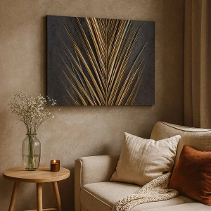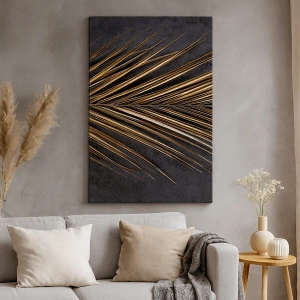 • Et moderne maleri, der forestiller et gyldent tropisk blad på en sort baggrund. Det minimalistiske design bringer elegance og luksus til ethvert interiør. Et ideelt valg til stilfuld indretning.