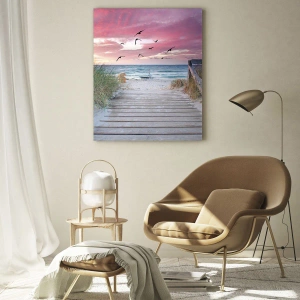 En sti lavet af arrangerede brædder fører øjet til vandet, åbner op for rum og inviterer symbolsk beskueren til at fordybe sig i kystlandskabet. Et træhegn, vildt græs og sand komplementerer billedets realistiske karakter. Det er et syn, vi genkender fra sommervandringer og ferieminder – fuld af harmoni, varme og kontakt med naturen. Et sådant maleri bringer ikke kun skønhed, men også trøst til interiøret.