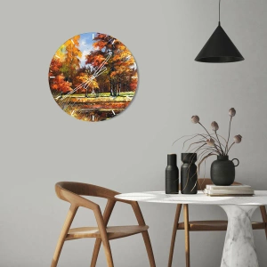- Dette vægur har en efterårsskov fuld af farverige blade og varmt lys. Perfekt til naturelskere og maleriske landskaber.