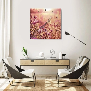 Vægur, Uret - Lilla blomster i en mark ved solnedgang i varmt lys - 30x30cm - Før sommeren er forbi - Moderne vægdekoration til stue, køkken og soveværelse ARTTOR
