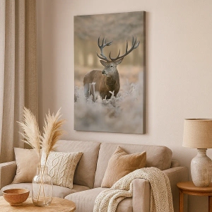 Maleriet begejstrer med sin præcision og fremhæver hjortens pelsstruktur og lysningens frostklare detaljer. Baggrunden af træer badet i en vinteraura tilføjer dybde og udtryksfuldhed til kompositionen, hvilket gør den til en ideel dekoration for naturelskere og minimalistiske landskaber.