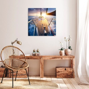 Lærredstryk "Løb på bølgerne" er en inspirerende komposition for hav- og naturelskere. Det forestiller en yacht, der sejler på roligt vand i lyset af den nedgående sol og skaber en atmosfære af harmoni og fred.