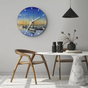 Væguret "Slutningen på en god dag" er et unikt tilbud for elskere af malede landskaber og atmosfæriske udsigter. Urskiven forestiller en rolig havn fuld af fortøjede sejlbåde, der spejler sig i overfladen af det stille vand. Himlen, oplyst af de varme toner fra den nedgående sol, overgår jævnt fra blå til pastel orange og skaber et harmonisk landskab.