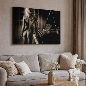 Lærredstryk - Billede på lærred - Kvindelig nøgen ved klaveret i sort-hvid stil - 70x50cm - Aftenens perfekte harmoni - Moderne vægdekoration til stue og soveværelse ARTTOR