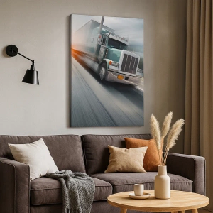 - En dynamisk scene, der forestiller en lastbil, der suser ned ad en motorvej ved solnedgang. Dette motiv, fuld af energi og bevægelse, vil perfekt komplementere moderne interiører.