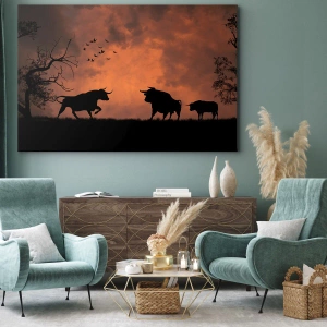 Silhuetter af tyre mod en orange himmel ved solnedgang er en dekoration, der kombinerer naturens kraft med landskabets subtile skønhed. Dette lærredstryk bringer energi, fred og inspiration til interiører og skaber en unik atmosfære.