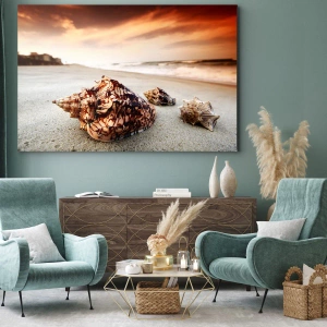 Dette maleri er omhyggeligt skabt på premium lærred, hvilket garanterer fremragende kvalitet og holdbarhed. Trykteknikken fremhæver detaljerne i muslingeskaller og de realistiske nuancer af solnedgangen. Takket være det vandrette format på 70x50 cm vil det fungere perfekt som et dekorativt fokuspunkt i en stue, et soveværelse eller et kontor.