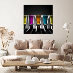 Motivet med farverige glas symboliserer modernitet, elegance og stil. Maleriet inspirerer til en atmosfære af luksus og sjov, hvilket giver rummet en unik karakter. Det er et fremragende valg for elskere af samtidskunst, fotografi og moderne dekorative former.