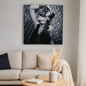 - Et maleri, der forestiller en kvinde iført en venetiansk maske mod en baggrund af udsmykkede mønstre. Dette elegante motiv er fuld af mystik og stil, perfekt til interiør inspireret af kunst og glamour.