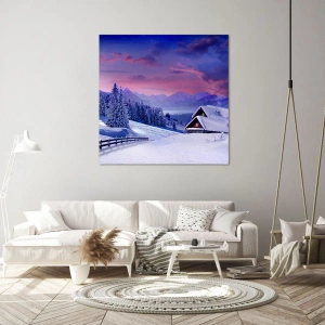 Lærredstryk - Billede på lærred - Vinterlandskab med bjerghytter ved solnedgang - 70x50cm - Stille nat - Moderne vægdekoration til stue og soveværelse ARTTOR