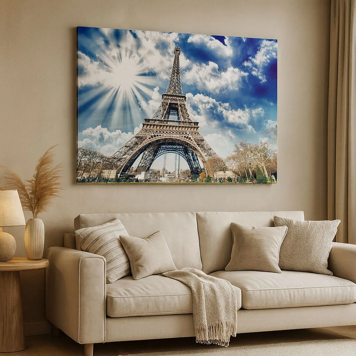- Maleriet forestiller Eiffeltårnet, omgivet af solstråler, mod en dynamisk, overskyet himmel. Et ikon for Paris i al sin pragt, det er den perfekte dekoration for elskere af arkitektur og romantiske landskaber.