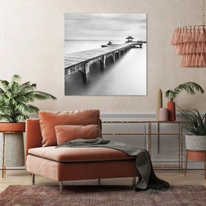 - Maleriet forestiller et sort-hvidt billede af en træmole, der strækker sig over roligt vand. Dets minimalistiske stil og harmoniske komposition gør det til en perfekt dekoration til elegante interiører.