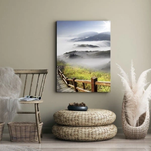 - Maleriet forestiller en træsti, der fører gennem et tåget bjerglandskab tidligt om morgenen. De blide sollysstråler og grønne områder bringer harmoni og fred.