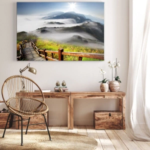 Lærredstryk - Billede på lærred - En træsti blandt de tågede bjerge om morgenen - 70x50cm - Vævet mod blænding og tåge - Moderne vægdekoration til stue og soveværelse ARTTOR