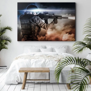 Hver detalje i maleriet er omhyggeligt gengivet, fra teksturerne i soldatens tøj til de præcise detaljer i våbnet. Kompositionen indfanger perfekt spændingen og dynamikken i situationen, hvilket gør dette maleri til et ideelt valg for elskere af militaria, taktik og moderne militærteknologi. Dramatiske lyseffekter i baggrunden forstærker yderligere indtrykket af realisme.
