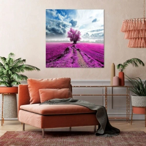 Vægmaleri - Hedeland - Vildmark - Ensomt træ på en mark i en intens pink nuance